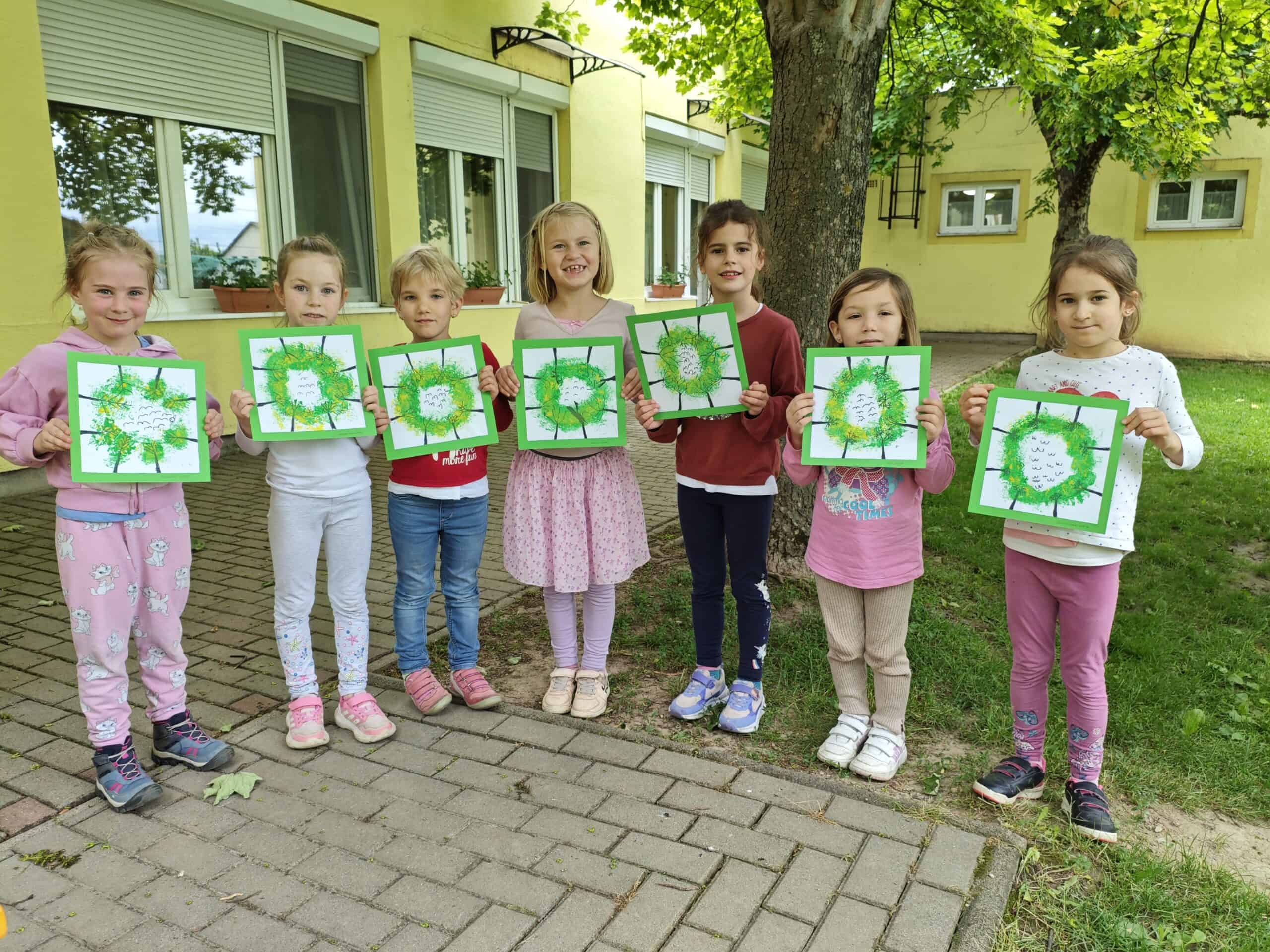 Negyedik Bütykölde klubunkban békaperspektívában ábrázoltunk zöld lombos, virágos fákat. A fák törzsét és ágait fekete filctollal rajzolták meg a gyerekek, a lombozatot pedig festékbe mártott, gyűrt papírzsebkedővel varázsolták rá.